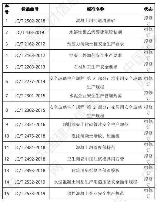 在拟修订的359项行业标准中,包括15项建材行业标准。