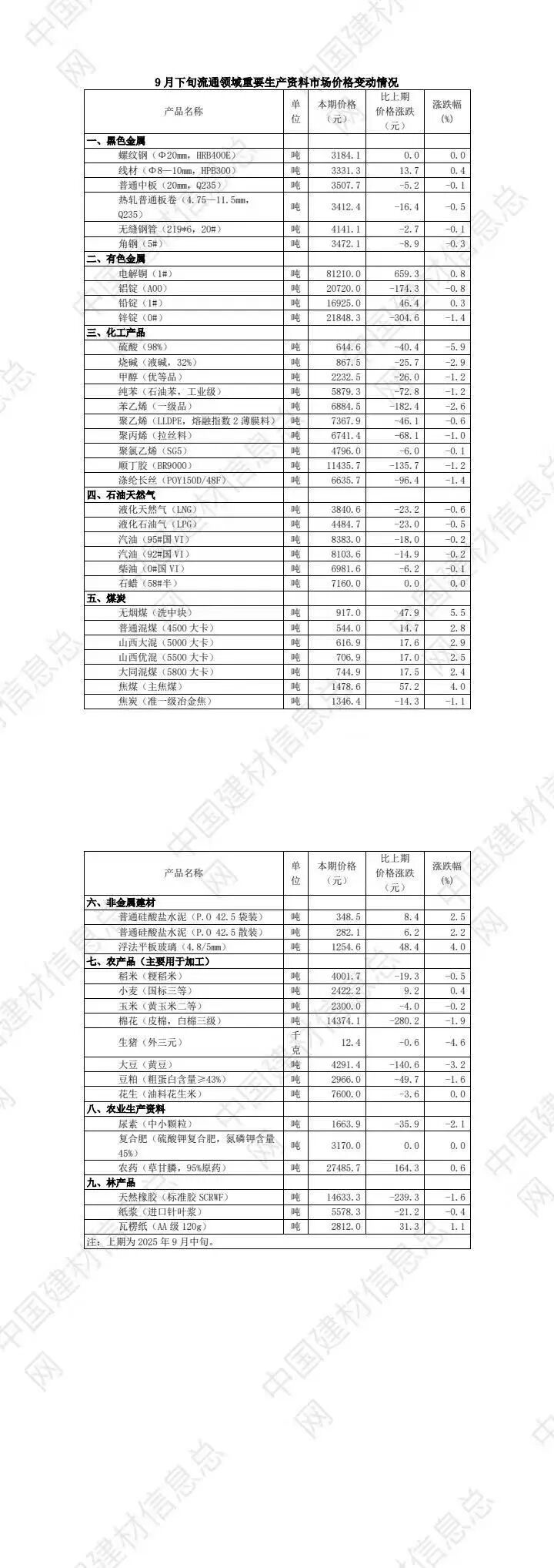 国家统计局近日对全国流通领域9大类50种重要生产资料市场价格的监测显示,2025年9月下旬与9月中旬相比,15种产品价格上涨,31种下降,4种持平。其中,包括普通硅酸盐水泥(P.O 42.5袋装)、普通硅酸盐水泥(P.O 42.5散装)及浮法平板玻璃(4.8/5mm)3种非金属建材价格情况。