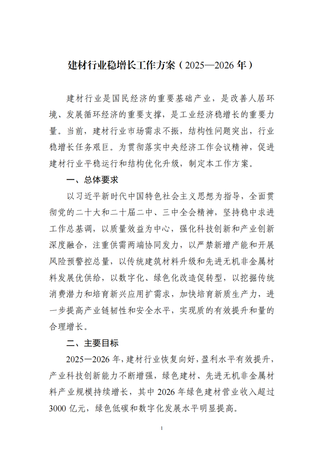 方案还明确了一系列2025年至2026年建材行业稳增长主要目标:建材行业恢复向好,盈利水平有效提升,产业科技创新能力不断增强,绿色建材、先进无机非金属材料产业规模持续增长,绿色低碳和数字化发展水平明显提高。