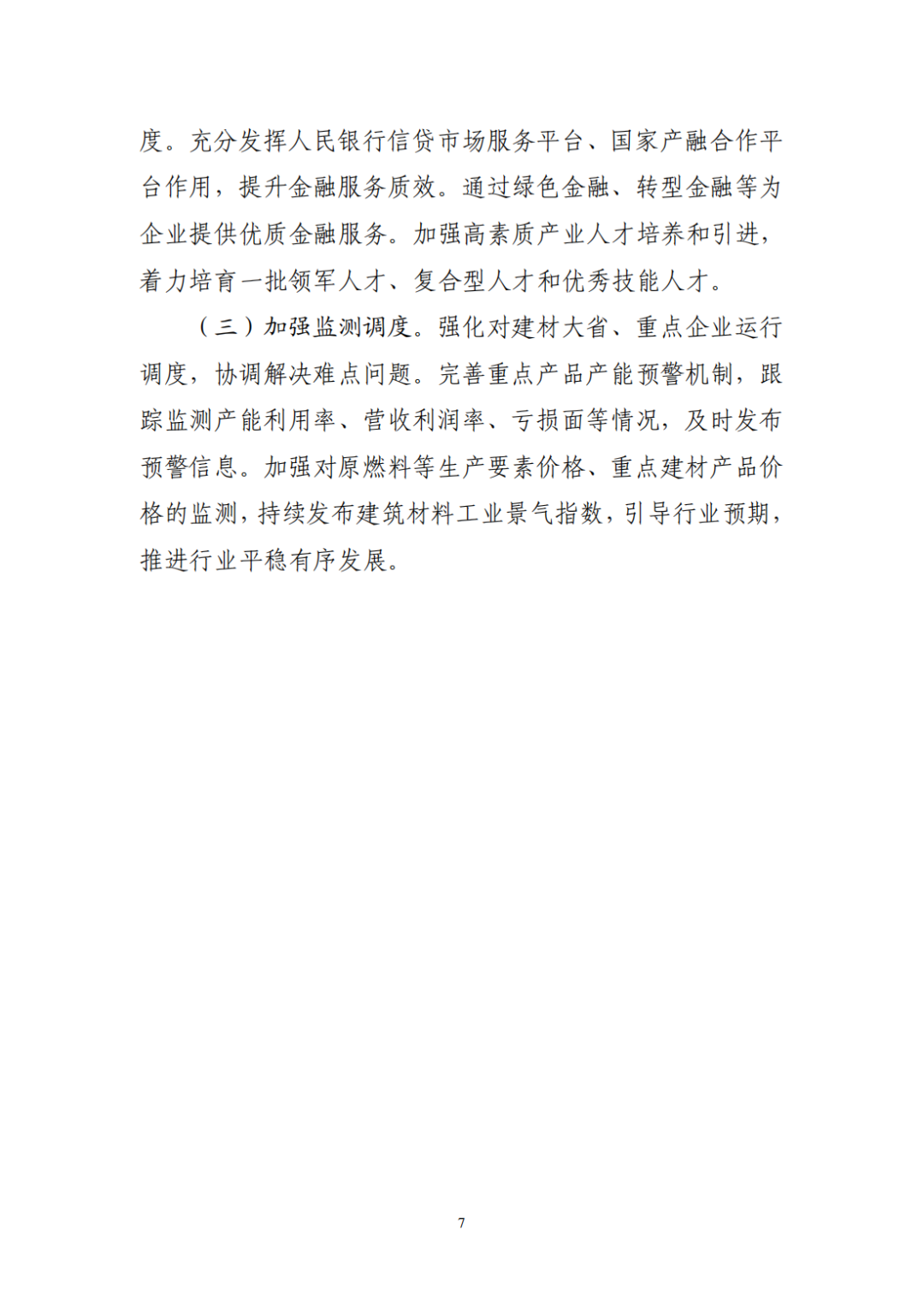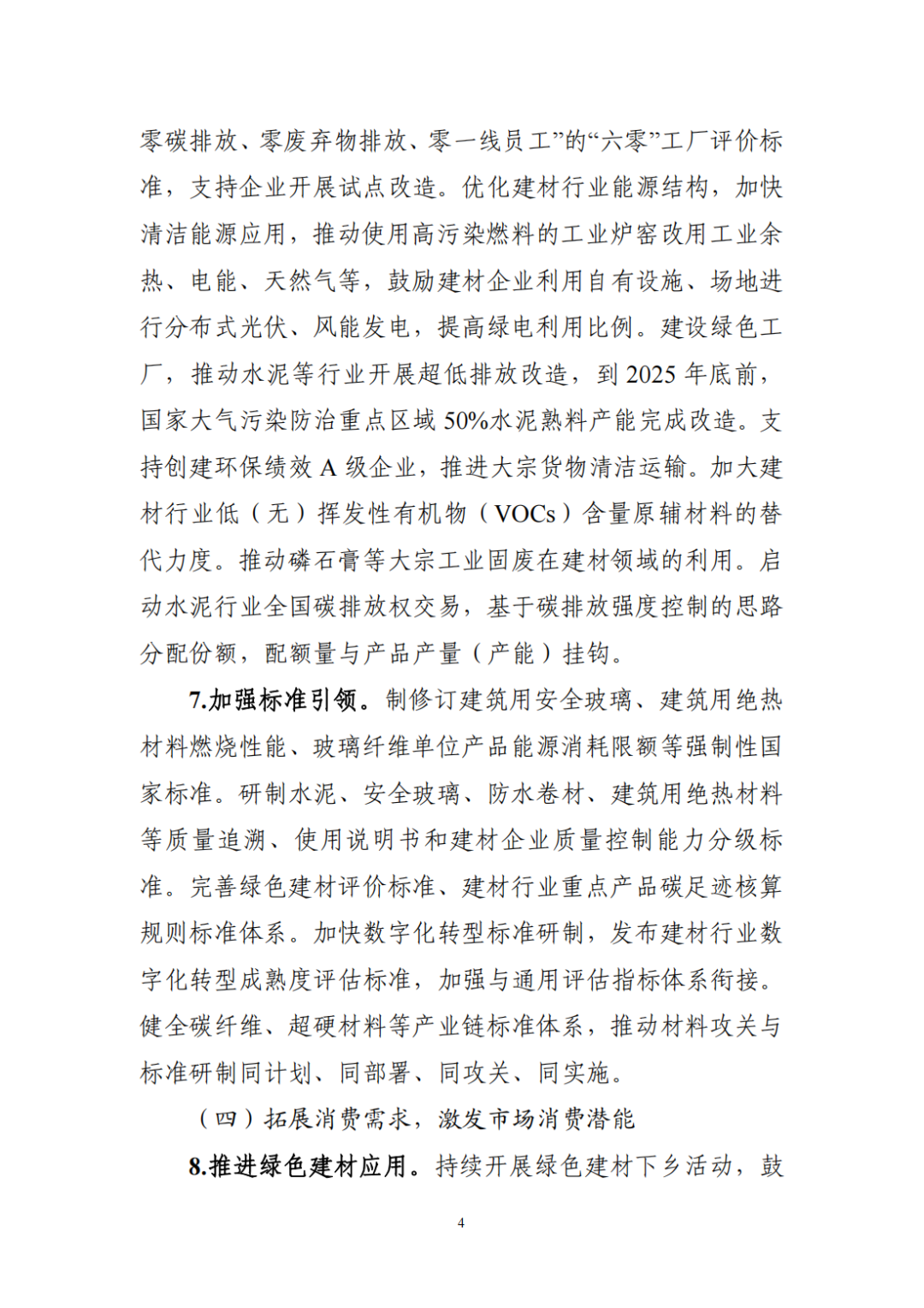 扩需求,挖掘传统消费潜力、培育新兴应用。持续开展绿色建材下乡活动,落实政府采购支持绿色建材促进建筑品质提升政策;支持建立无机非金属材料生产企业上下游合作机制,推动金刚石、先进陶瓷、低介电玻璃纤维制品等推广应用。